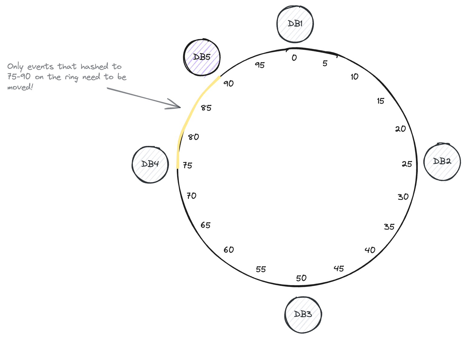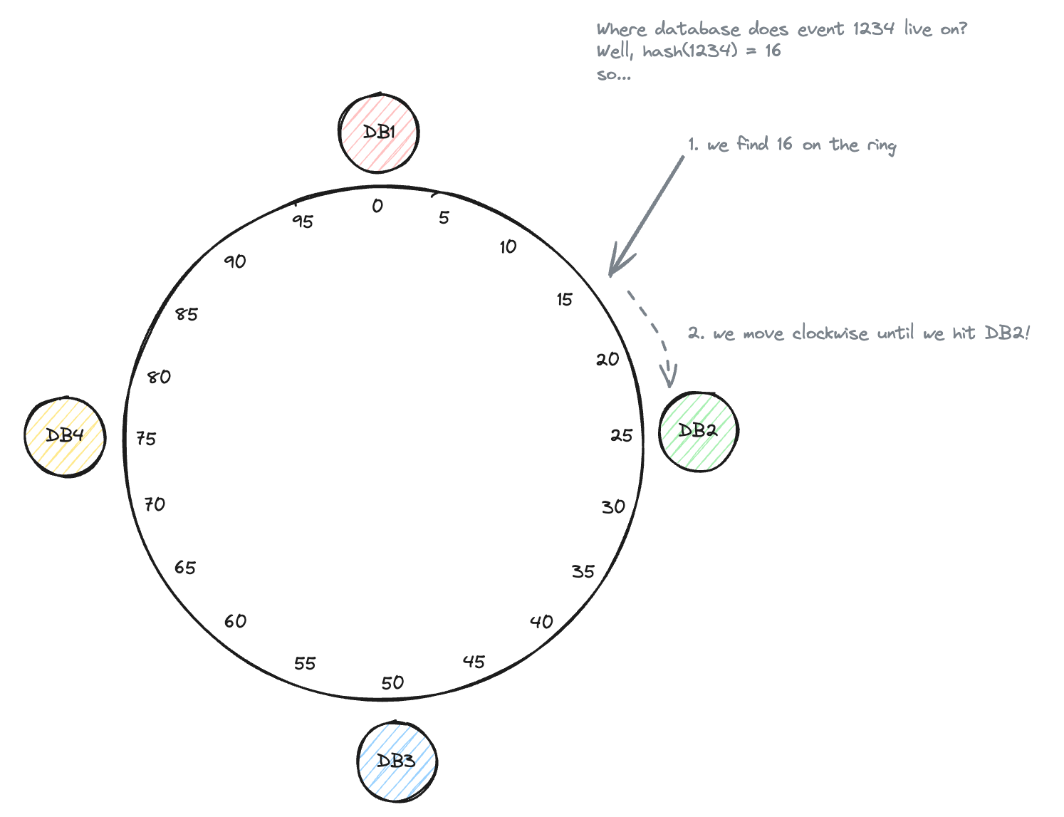 database_id = hash(order_id) % num_databases- Problem: Add/Remove database instance costs the data in all databases to be re-distributed as the number of databases changes.