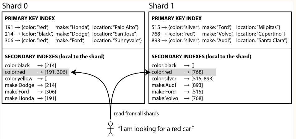 - Each shard maintain its own secondary indexes, covering only the records in that shard.