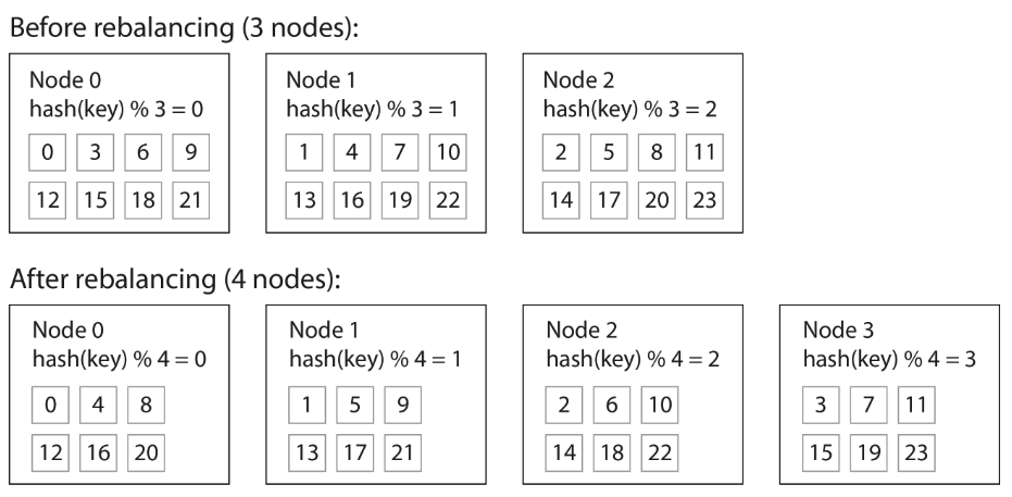 hash(key) % number of nodes - Issue: Change in number of nodes, keys need to be rebalanced from one node to another.