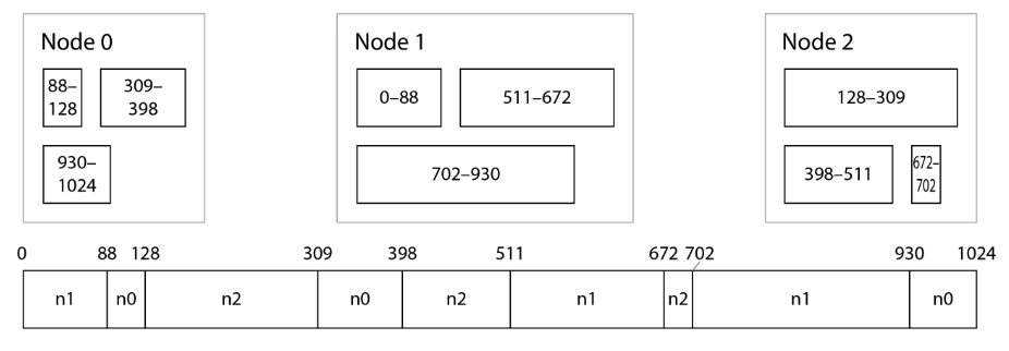 - Split the range of possible hash values into contiguous ranges with random boundaries, and assign several ranges to each node.