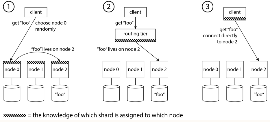 - Send all requests from clients to routing tier first, which determines the node that should handle each request and forwards it accordingly.