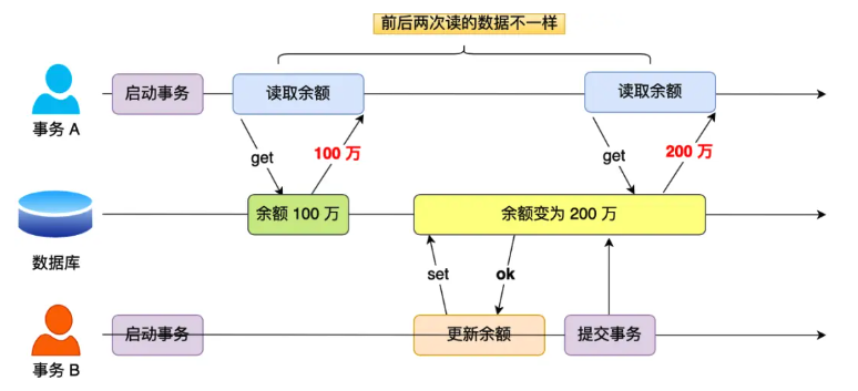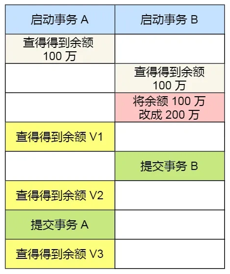 - Two concurrent transactions are involved: Transaction A is only responsible for querying the balance, while Transaction B changes the balance to 2 million. Below is the behavior of the two transactions executed in chronological order: