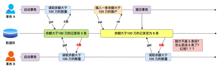 - Then, Transaction B queries again for accounts with a balance greater than 1 million and now finds 6 records, which differs from the previous query's result. This creates the illusion of a "phantom" change, and this phenomenon is called a phantom read.