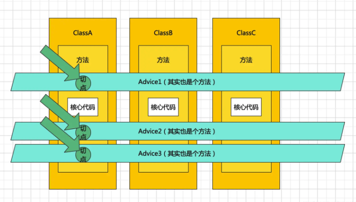 - AOP first defines some Advice (enhancements) within an Aspect (aspect), which includes the specific implemented code, while also organizing the join points.