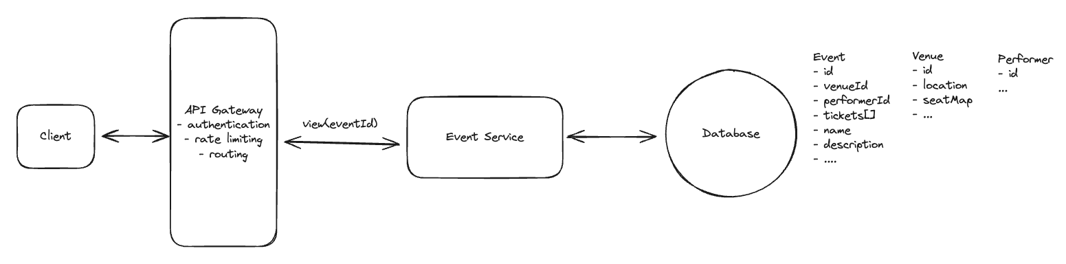 - The Event Service then queries the Events DB for the event, venue, and performer information and returns it to the client.